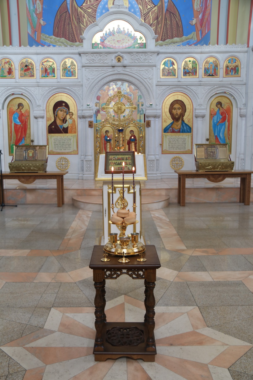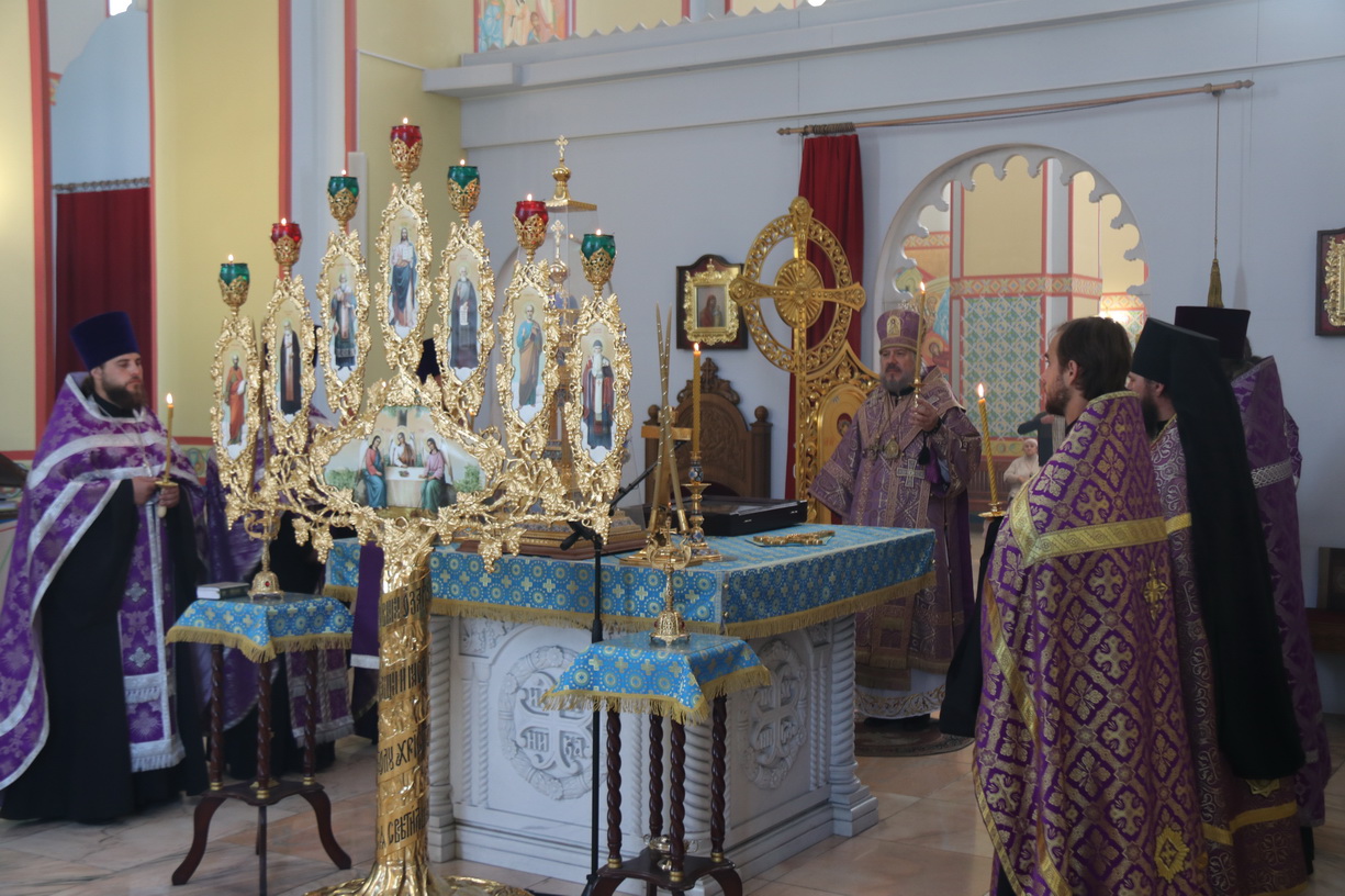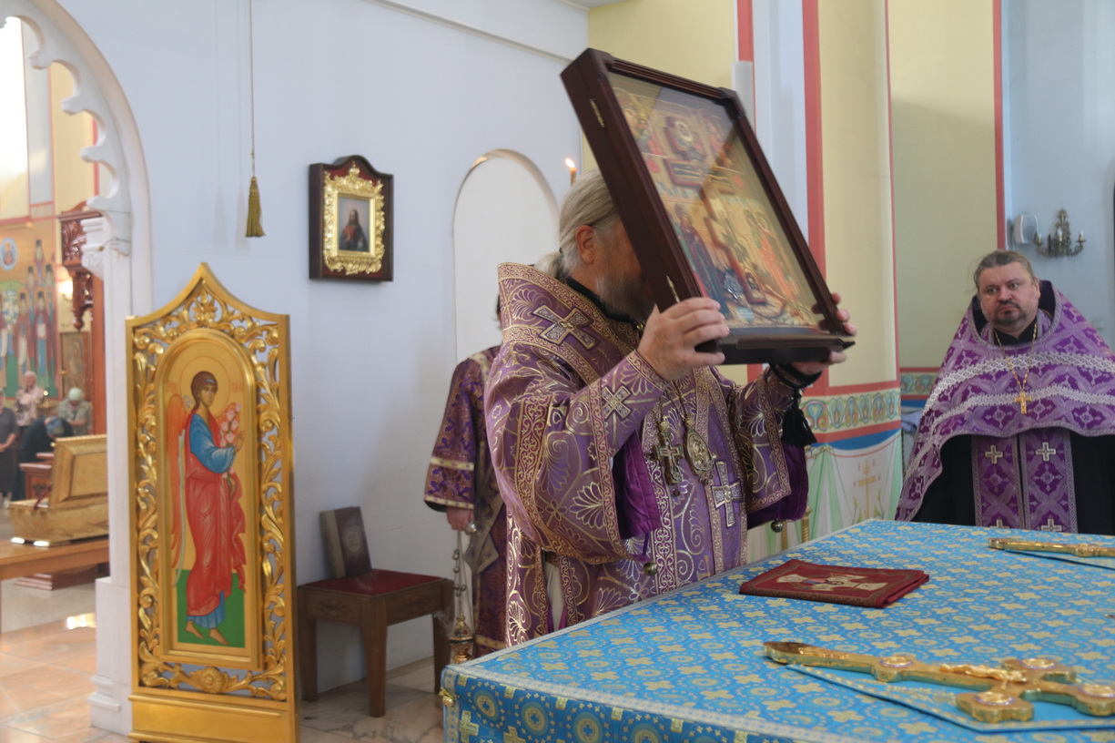 Перед началом богослужения под пение тропаря Животворящему Кресту на престол была возложена икона Распятия Господа с частицей Животворящего Креста.