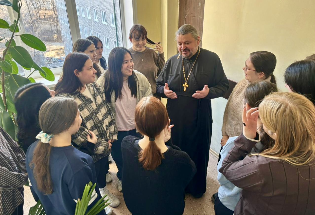 Студентки — будущие преподаватели начальных классов, с интересом слушали священника и задавали личные вопросы.