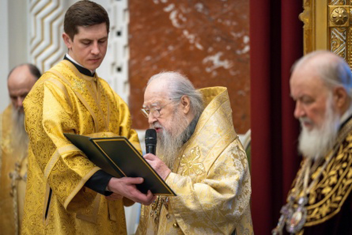 После Литургии митрополит Воскресенский Григорий огласил поздравительный адрес от Священного Синода и преподнес в дар Патриарху икону Божией Матери «Одигитрия». К поздравлениям присоединились представители государственной власти.