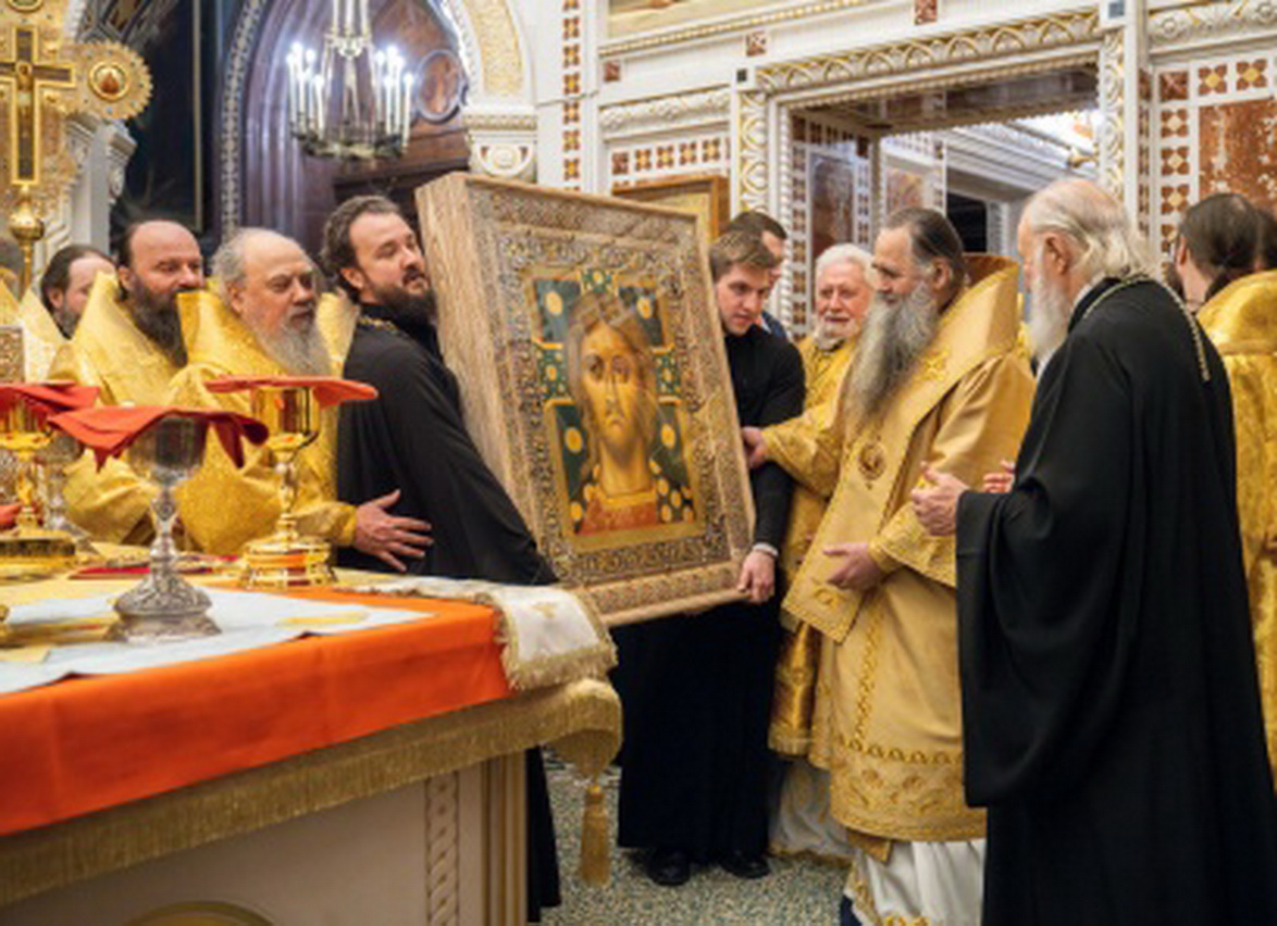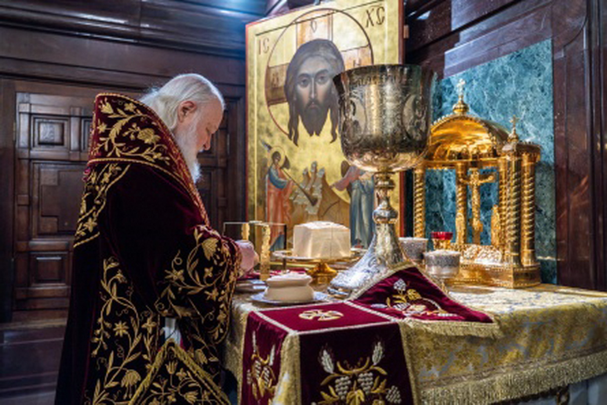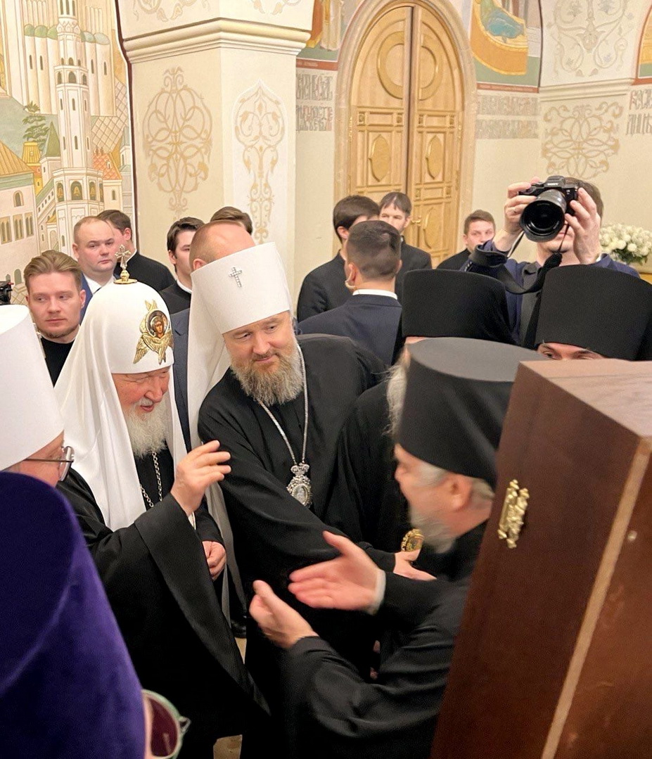 Перед началом Божественной литургии Святейший Патриарх совершил поклонение мощам святителя Филарета, митрополита Московского. Его Святейшество совершал богослужение в тех же интронизационных облачениях и с копией жезла святителя Петра, что и семнадцать лет назад.