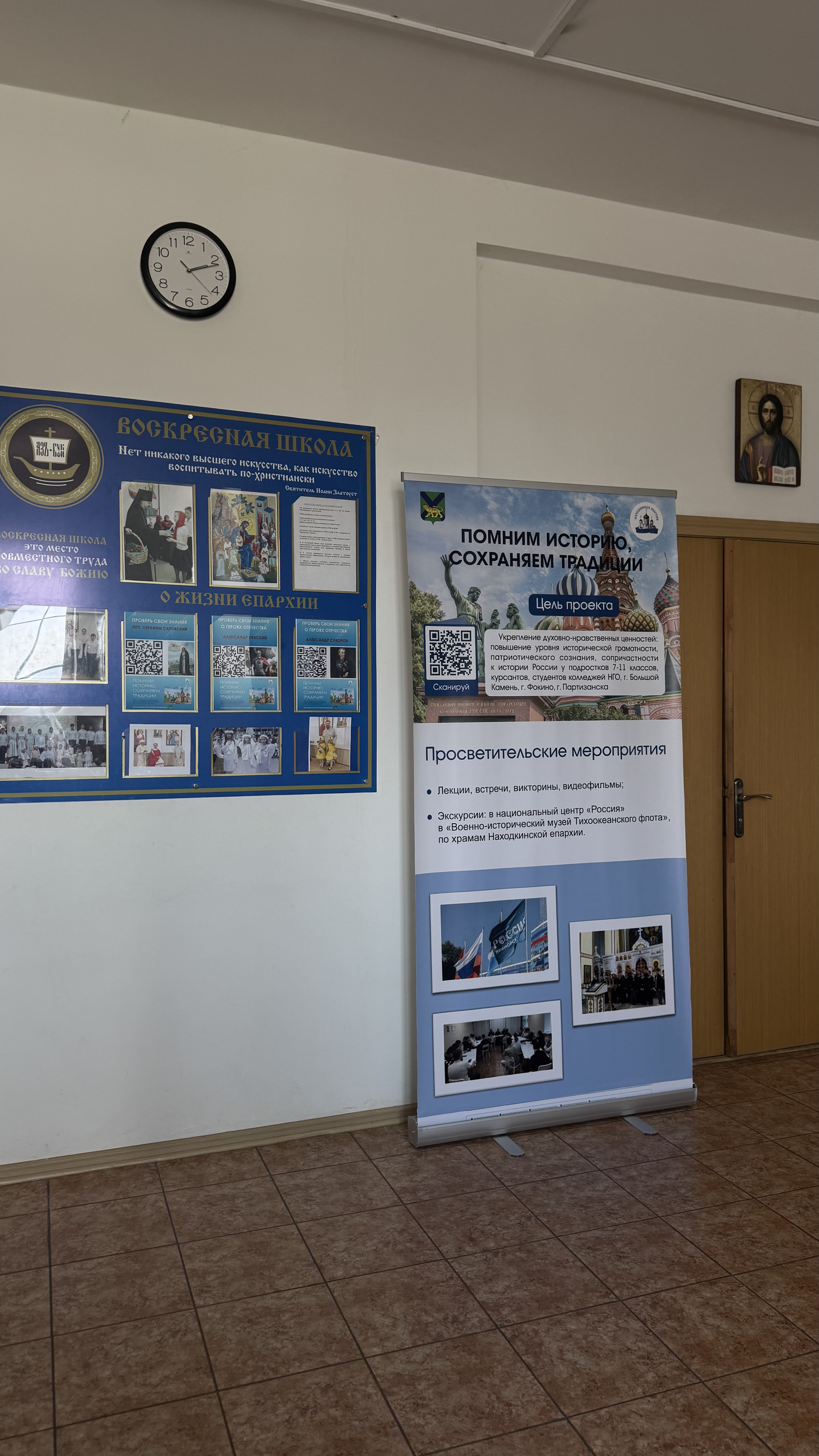 В холле Духовно-просветительского центра Находкинской епархии установлен информационный баннер «Помним историю, сохраняем традиции» с динамическим QR-кодом, с помощью которого можно узнать подробности реализации проекта.