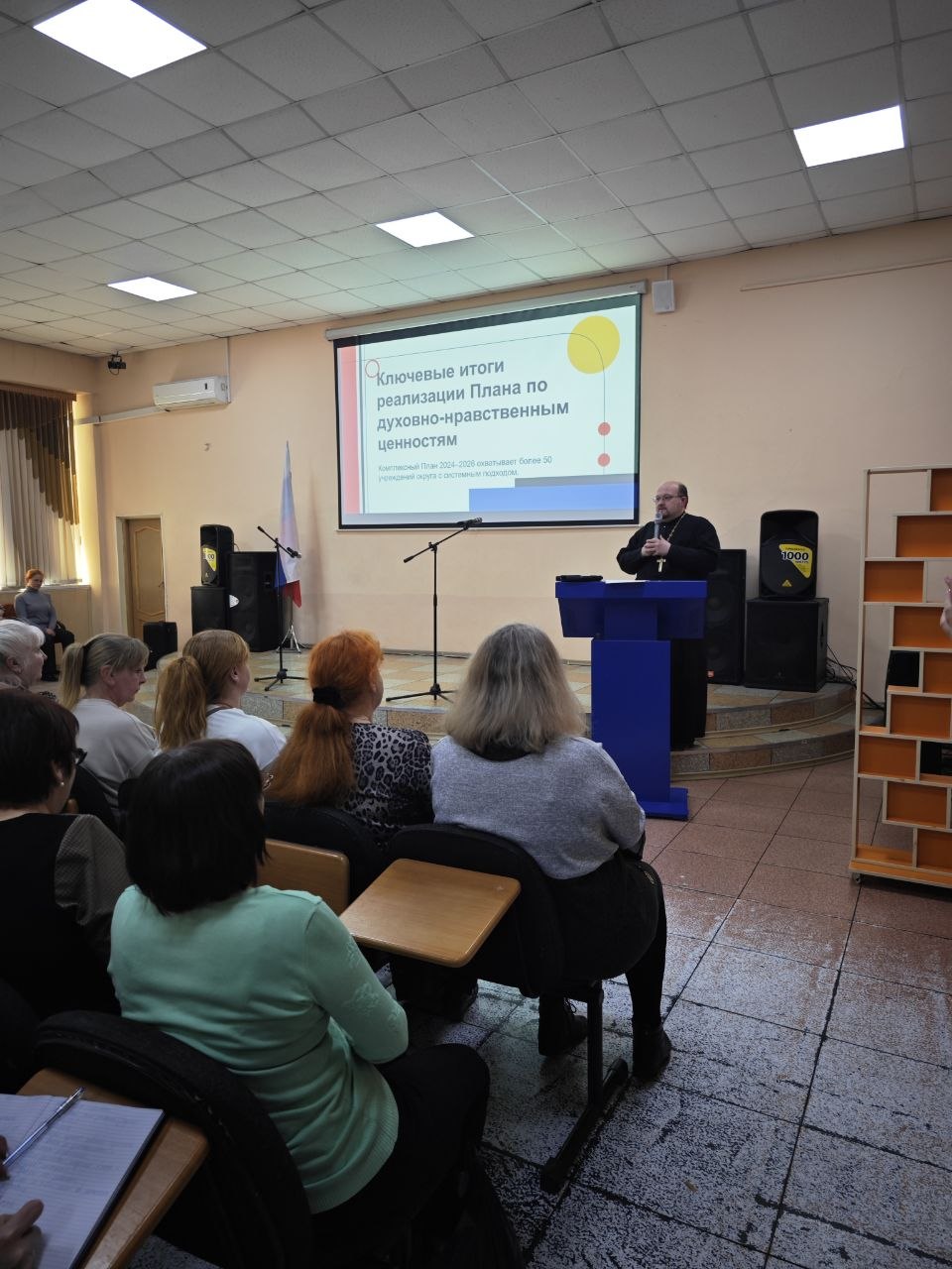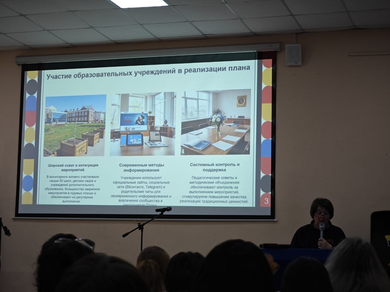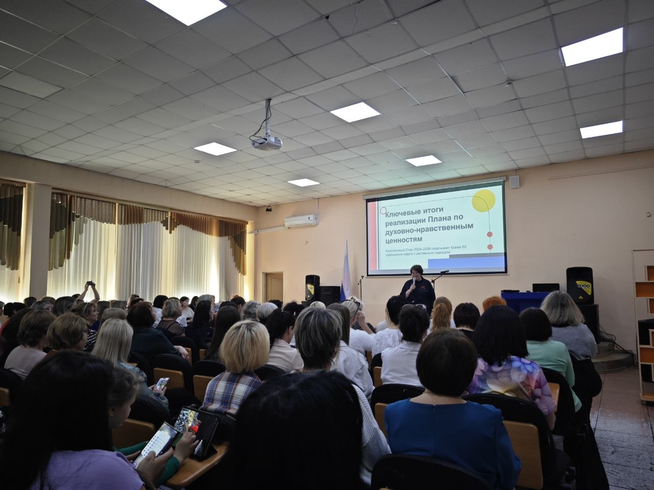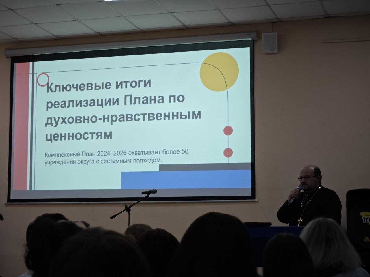 Педагоги обсудили переход от формального выполнения планов к глубокой, осмысленной работе по формированию традиционных российских духовно-нравственных ценностей у подрастающего поколения. Были представлены педагогические практики: как говорить с детьми о главном.