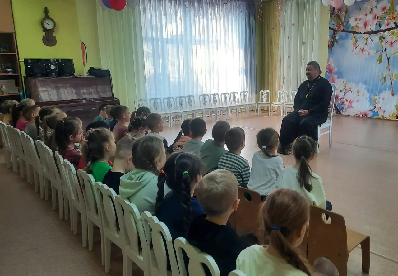 Руководитель миссионерского отдела Находкинской епархии иерей Виталий Шаркеев посетил детский сад № 39 г. Находки и побеседовал с дошкольниками о предстоящей Пасхе — Светлом Христовом Воскресении.