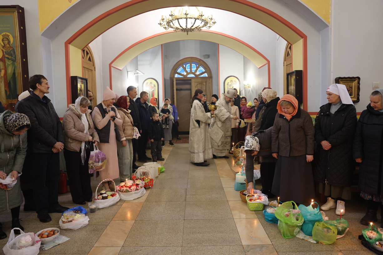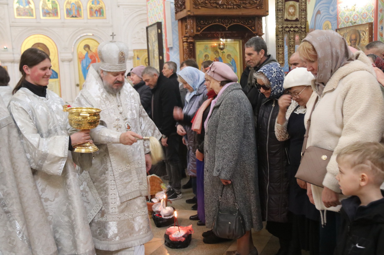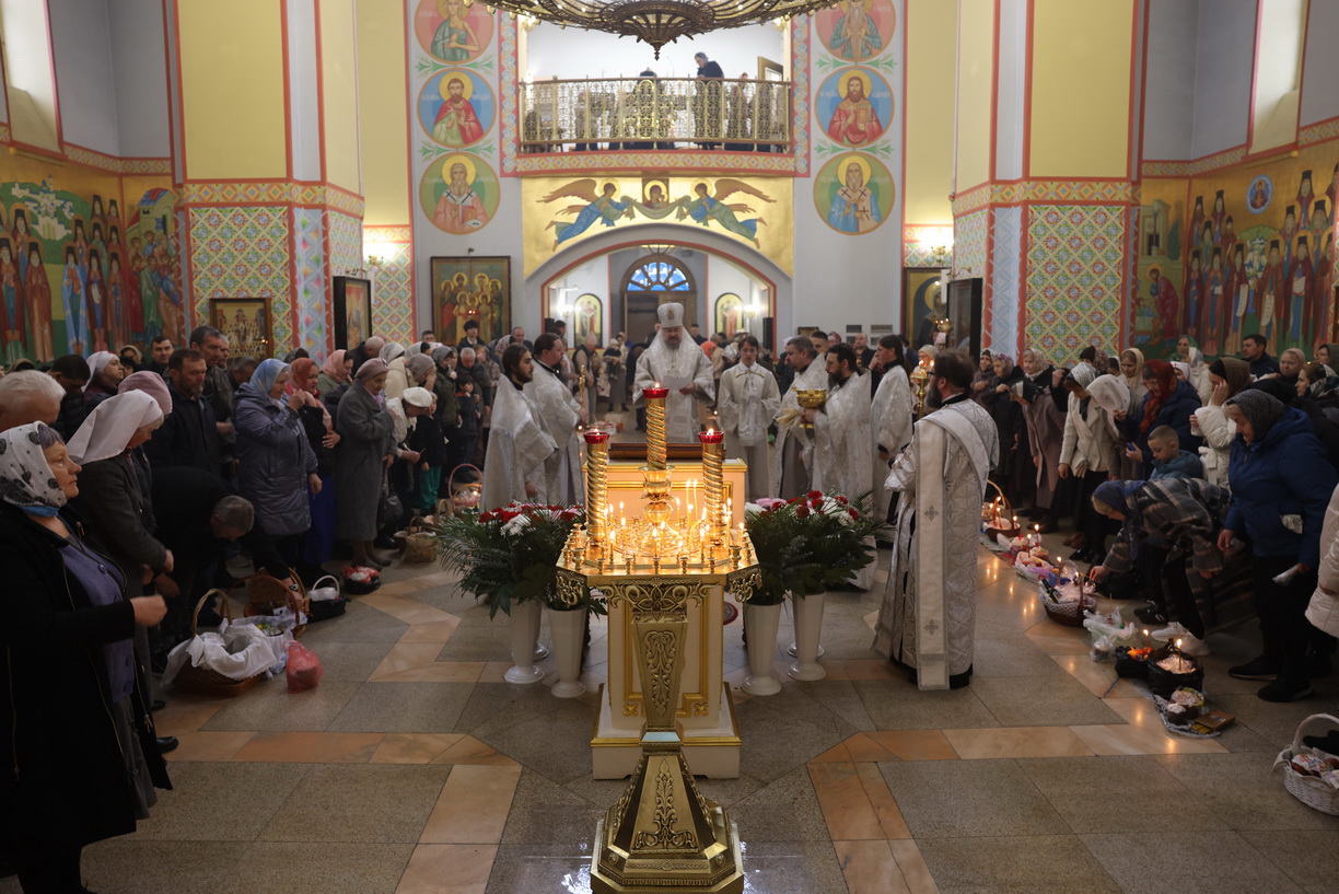 После отпуста Литургии архипастырь совершил, предписанное богослужебным Уставом, благословение хлебов и вина. Это благословение ежегодно совершается в память о том, как древние христиане, оставаясь в храме после Литургии до Пасхальной утрени, вкушением освященных хлеба и вина подкрепляли себя на подвиг бдения в эту священную и спасительную ночь.