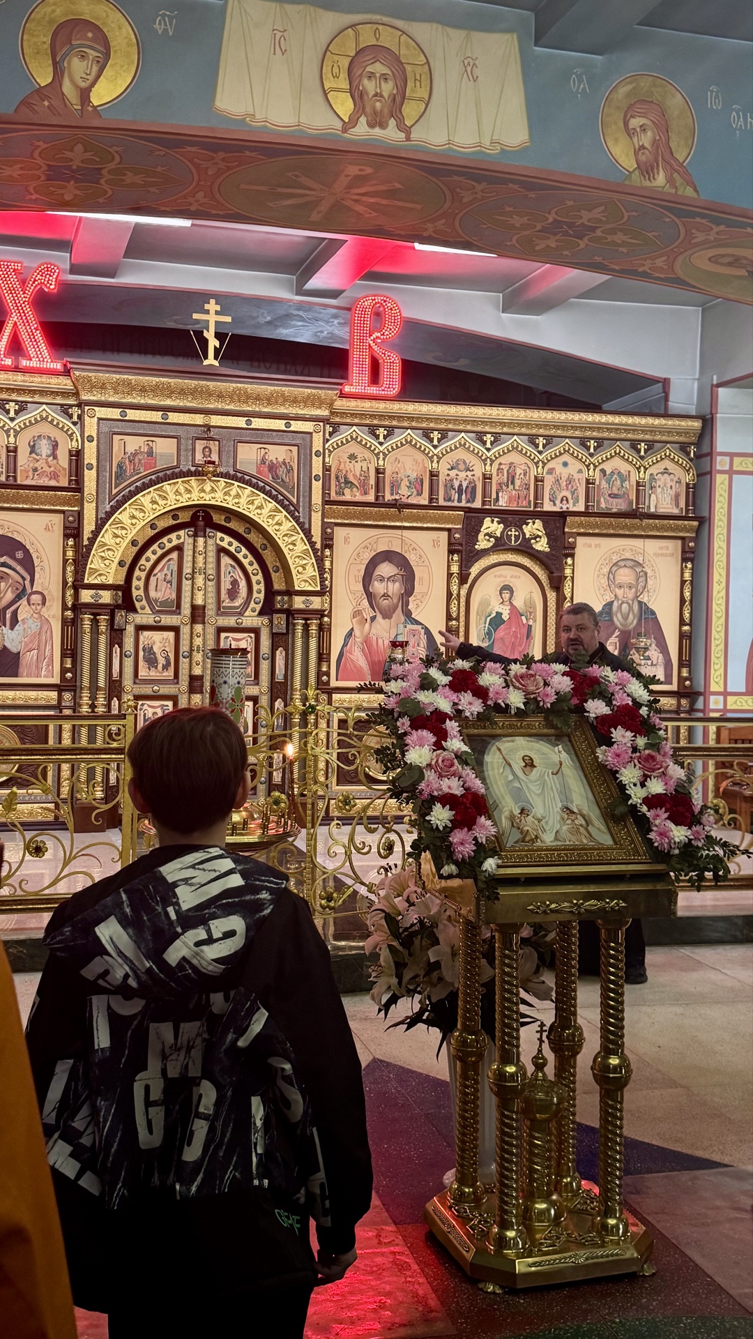 Погода для экскурсии выдалась солнечная. Отец Виталий тепло поприветствовал ребят и сопровождающего преподавателя. Знакомство с кафедральным Казанским собором началось с прихрамовой территории. Ребята по школьной программе проходят храмовое зодчество, поэтому священник рассказал о разных стилях архитектуры православных храмов. В частности, у нашего собора в Находке, который является украшением города, крестово-купольная конструкция завершается пятью куполами. Центральный купол символизирует Христа, четыре купола поменьше — четырех евангелистов. Затем гостей познакомили с внутренним убранством нижнего Храма в честь святого преподобного Сергия Радонежского. Многие школьники знают, что надо крестится перед тем как зайти в церковь. С интересом дети рассматривали настенные и потолочные росписи, громадную люстру, которая называется паникадило. Узнали устройство иконостаса, отгораживающего центральную часть от алтаря, в котором совершаются церковные таинства. Как определить в честь кого назван Храм? Есть правило — справа от центральной иконы на иконостасе располагается изображение именно этого святого. Отец Виталий познакомил школьников со святынями: частицами мощей святых Оптинских старцев, большой старинной иконой Николая Чудотворца, иконой праздника — Воскресения Христова.