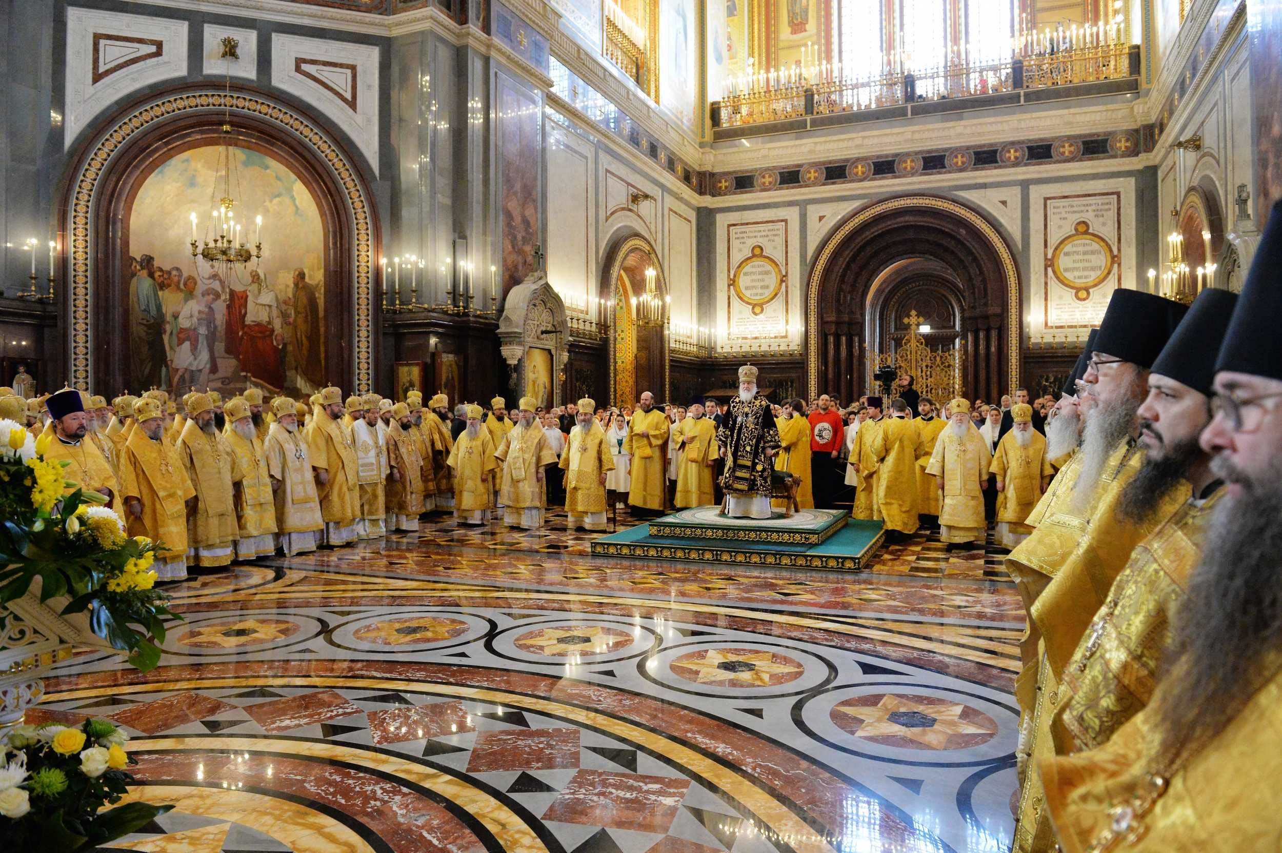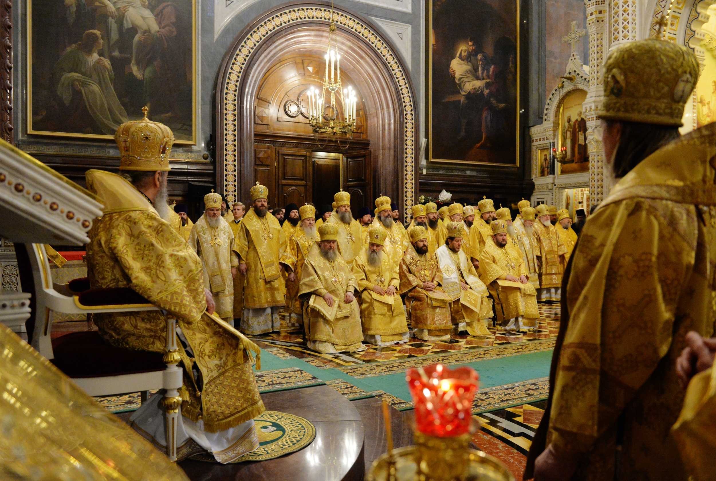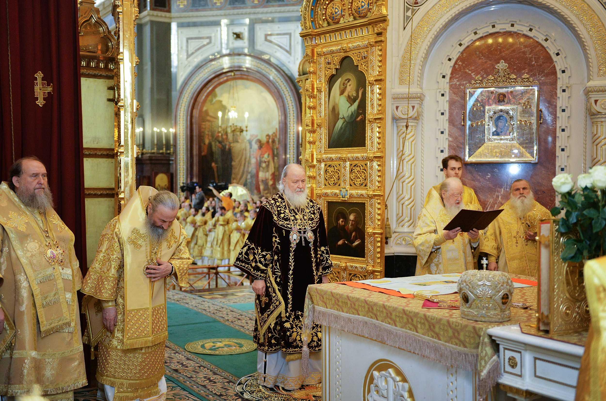 Предстоятелю Русской Православной Церкви сослужили: Блаженнейший митрополит Киевский и всея Украины Онуфрий; митрополит Крутицкий и Коломенский Ювеналий, Патриарший наместник Московской епархии; митрополит Астанайский и Казахстанский Александр, глава Митрополичьего округа в Республике Казахстан; митрополит Ташкентский и Узбекистанский Викентий, глава Среднеазиатского митрополичьего округа; митрополит Санкт-Петербургский и Ладожский Варсонофий, управляющий делами Московской Патриархии; митрополит Минский и Заславский Павел, Патриарший экзарх всея Беларуси; митрополит Волоколамский Иларион, председатель Отдела внешних церковных связей Московского Патриархата; митрополит Рижский и всея Латвии Александр; митрополит Чебоксарский и Чувашский Варнава; митрополит Пермский и Кунгурский Мефодий; митрополит Калужский и Боровский Климент, председатель Издательского Совета Русской Православной Церкви; митрополит Воронежский и Лискинский Сергий; митрополит Омский и Таврический Владимир; митрополит Ярославский и Ростовский Пантелеимон; митрополит Новгородский и Старорусский Лев; митрополит Тверской и Кашинский Виктор; митрополит Симбирский и Новоспасский Анастасий; митрополит Орловский и Болховский Антоний; митрополит Самарский и Тольяттинский Сергий; митрополит Истринский Арсений, первый викарий Патриарха Московского и всея Руси по г. Москве; митрополит Владимирский и Суздальский Евлогий; митрополит Тернопольский и Кременецкий Сергий; митрополит Петрозаводский и Карельский Константин; митрополит Виленский и Литовский Иннокентий; митрополит Курский и Рыльский Герман; митрополит Белгородский и Старооскольский Иоанн, председатель Синодального миссионерского отдела; митрополит Красноярский и Ачинский Пантелеимон; митрополит Йошкар-Олинский и Марийский Иоанн; митрополит Екатеринбургский и Верхотурский Кирилл; митрополит Аргентинский и Южноамериканский Игнатий; митрополит Иваново-Вознесенский и Вичугский Иосиф; митрополит Ростовский и Новочеркасский Меркурий, председатель Синодального отдела религиозного образования и катехизации; митрополит Казанский и Татарстанский Феофан; митрополит Брянский и Севский Александр; митрополит Архангельский и Холмогорский Даниил; митрополит Тамбовский и Рассказовский Феодосий; митрополит Нижегородский и Арзамасский Георгий; митрополит Саратовский и Вольский Лонгин; митрополит Рязанский и Михайловский Марк, председатель Финансово-хозяйственного управления Московского Патриархата; митрополит Улан-Удэнский и Бурятский Савватий; митрополит Кемеровский и Прокопьевский Аристарх; митрополит Кировоградский и Новомиргородский Иоасаф; митрополит Челябинский и Миасский Никодим; митрополит Ставропольский и Невинномысский Кирилл, председатель Синодального комитета по взаимодействию с казачеством; митрополит Саранский и Мордовский Зиновий; митрополит Ханты-Мансийский и Сургутский Павел; митрополит Вологодский и Кирилловский Игнатий; митрополит Барнаульский и Алтайский Сергий; митрополит Астраханский и Камызякский Никон; митрополит Пензенский и Нижнеломовский Серафим; митрополит Смоленский и Дорогобужский Исидор; митрополит Костромской и Нерехтский Ферапонт; митрополит Читинский и Петровск-Забайкальский Димитрий; иерархи Русской Православной Церкви.
