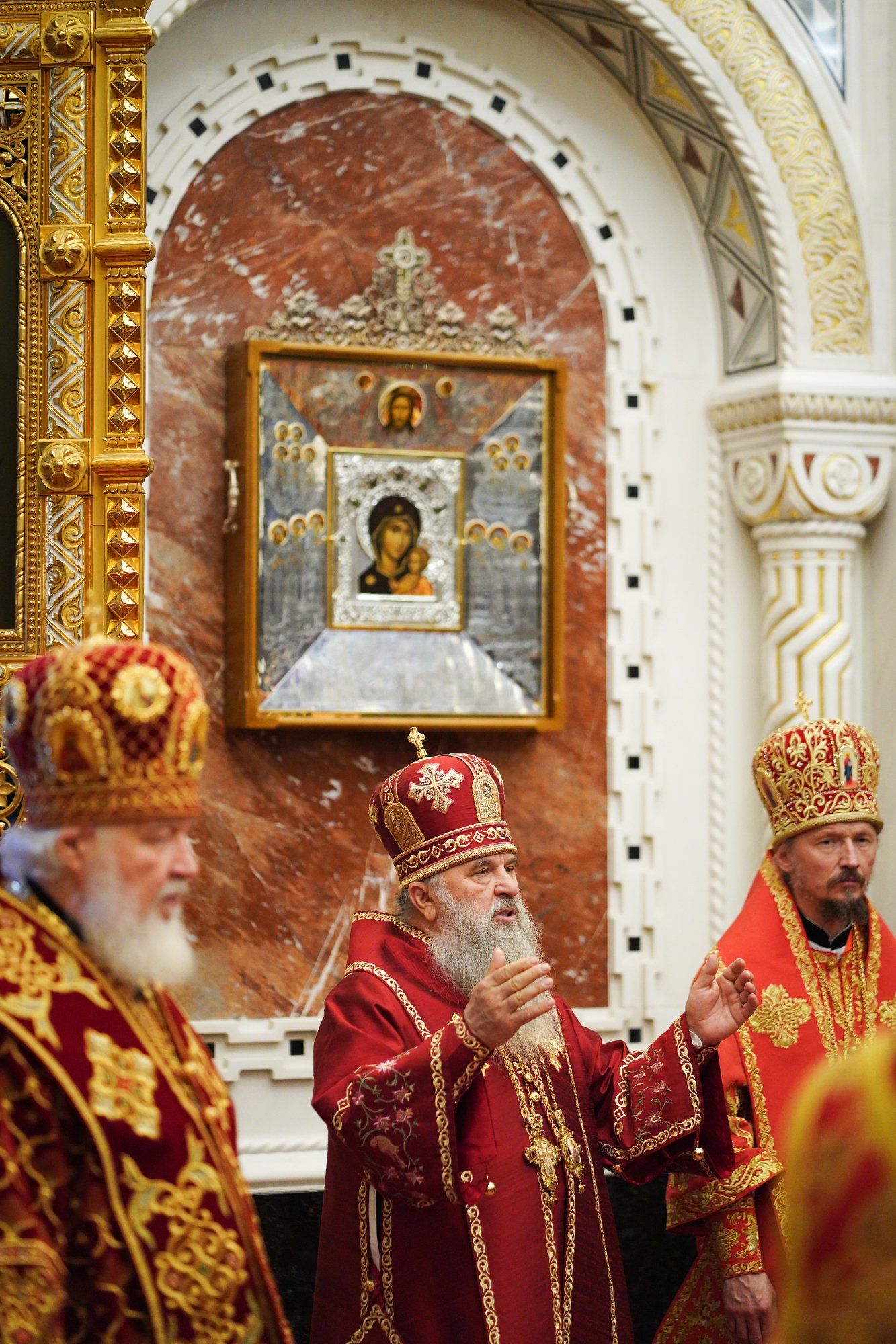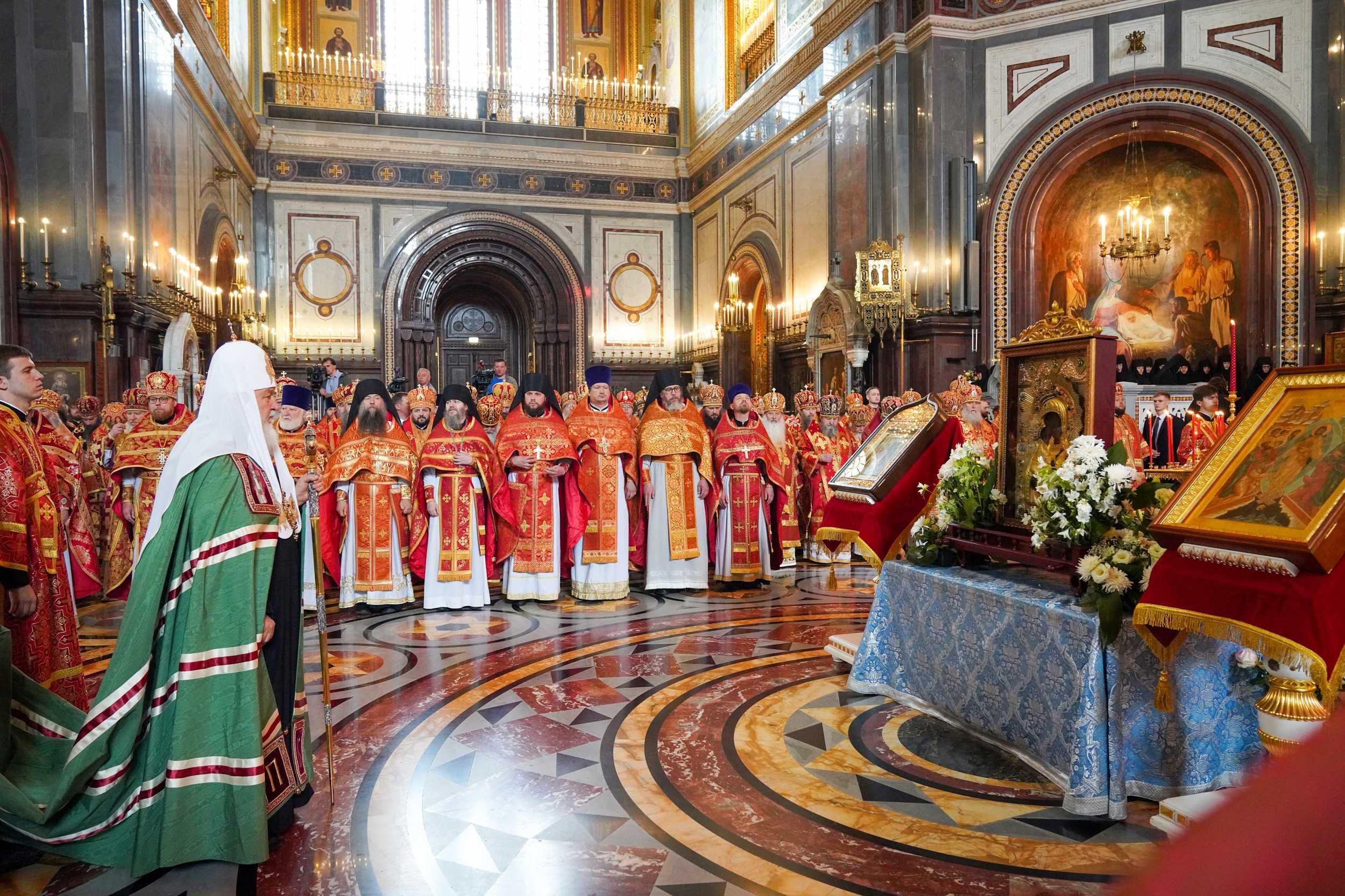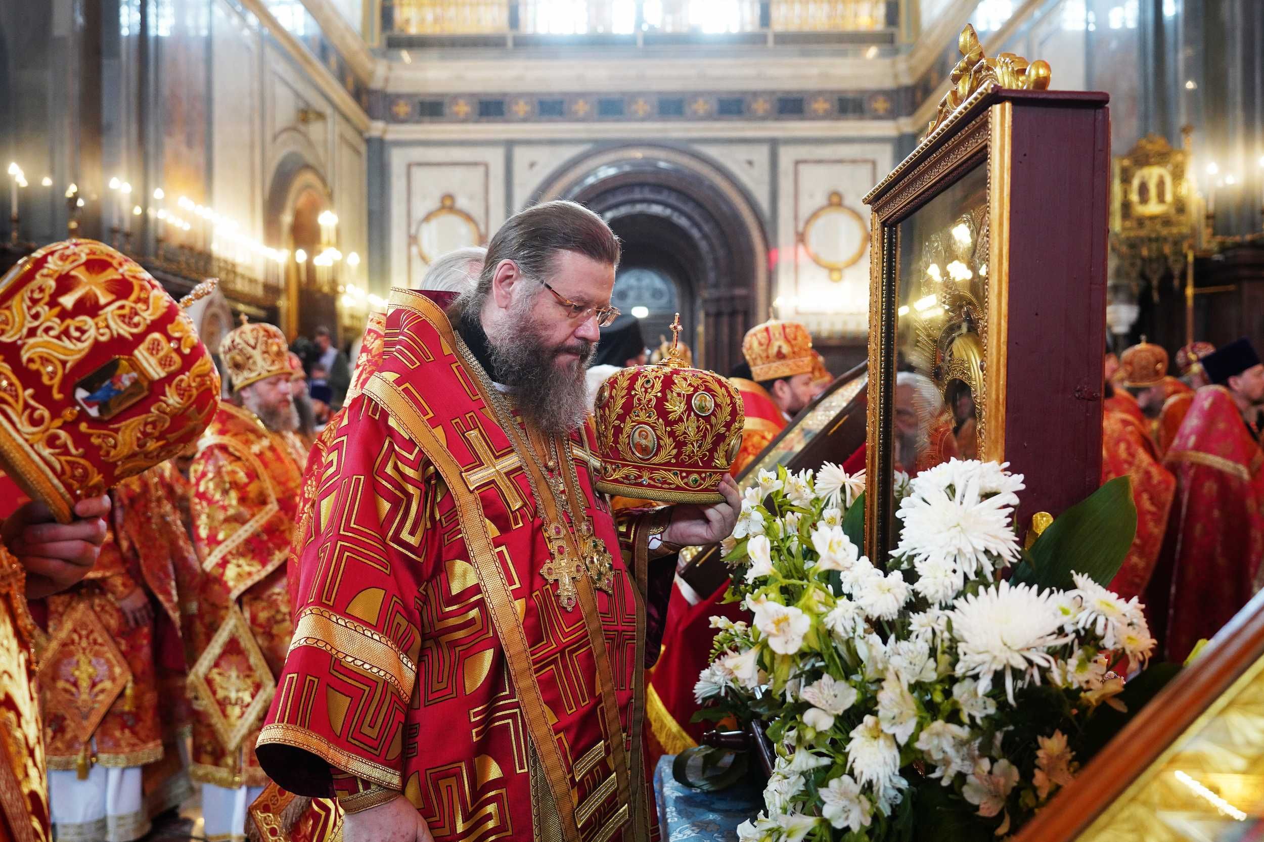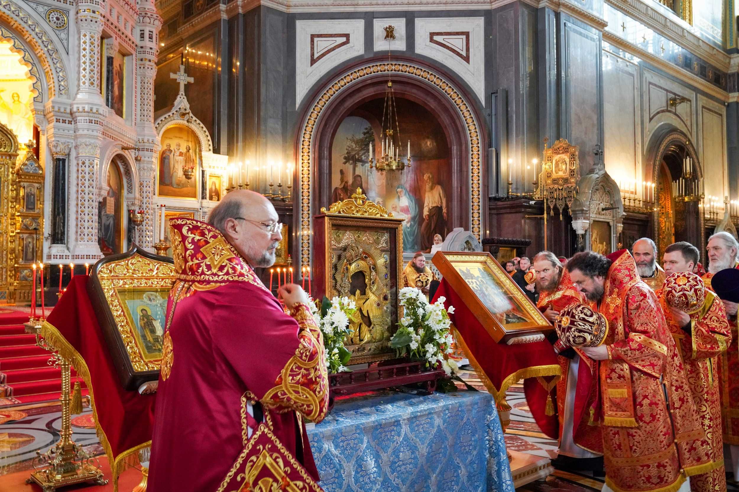 По прибытии в Храм Христа Спасителя Святейший Патриарх Кирилл поклонился чудотворной Феодоровской иконе Божией Матери, установленной в центре храма, и честным мощам святителя Филарета, митрополита Московского. Чудотворный Феодоровский образ 14 мая по благословению Его Святейшества был принесен в Москву из Богоявленско-Анастасииного монастыря г. Костромы.