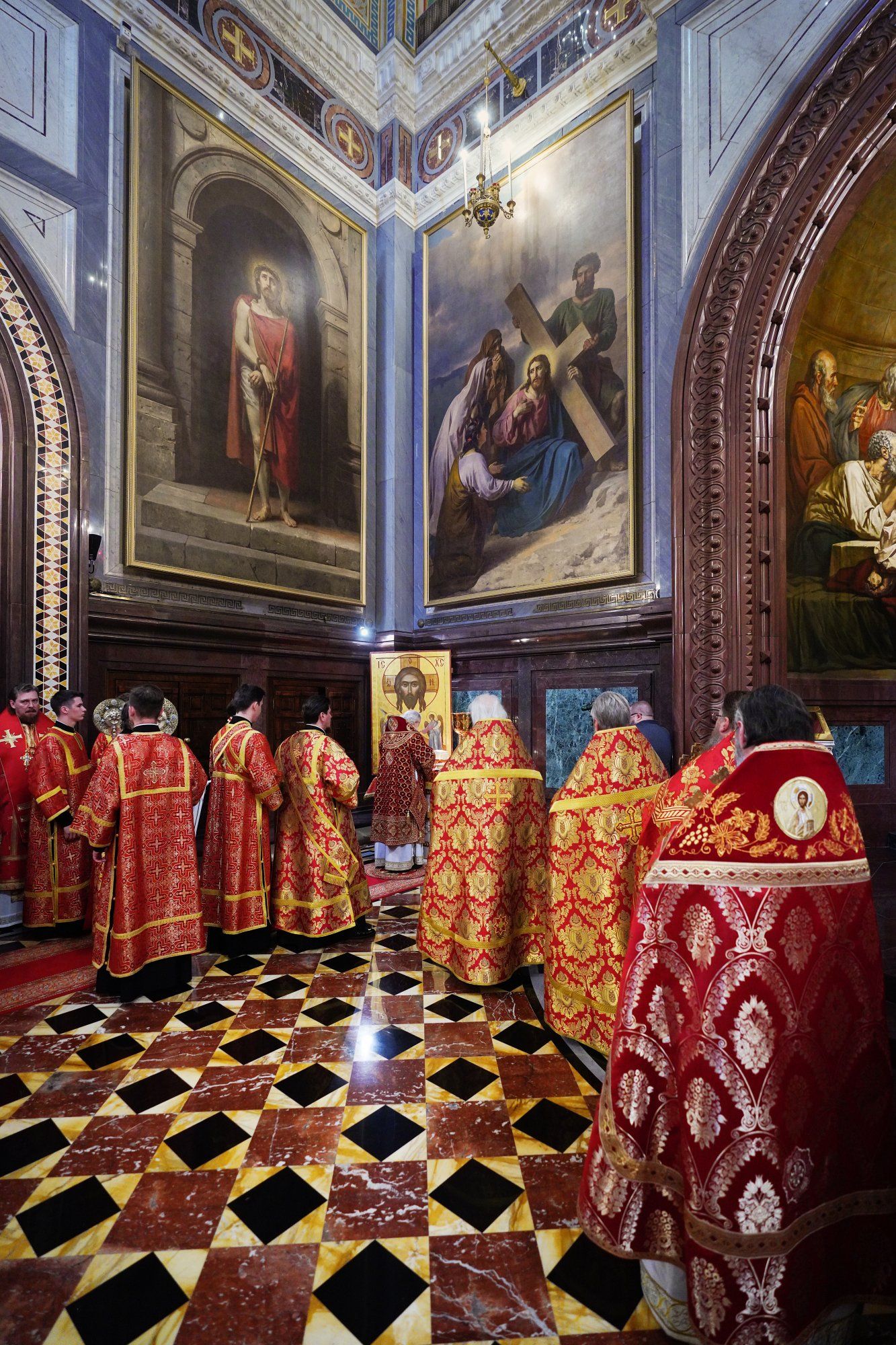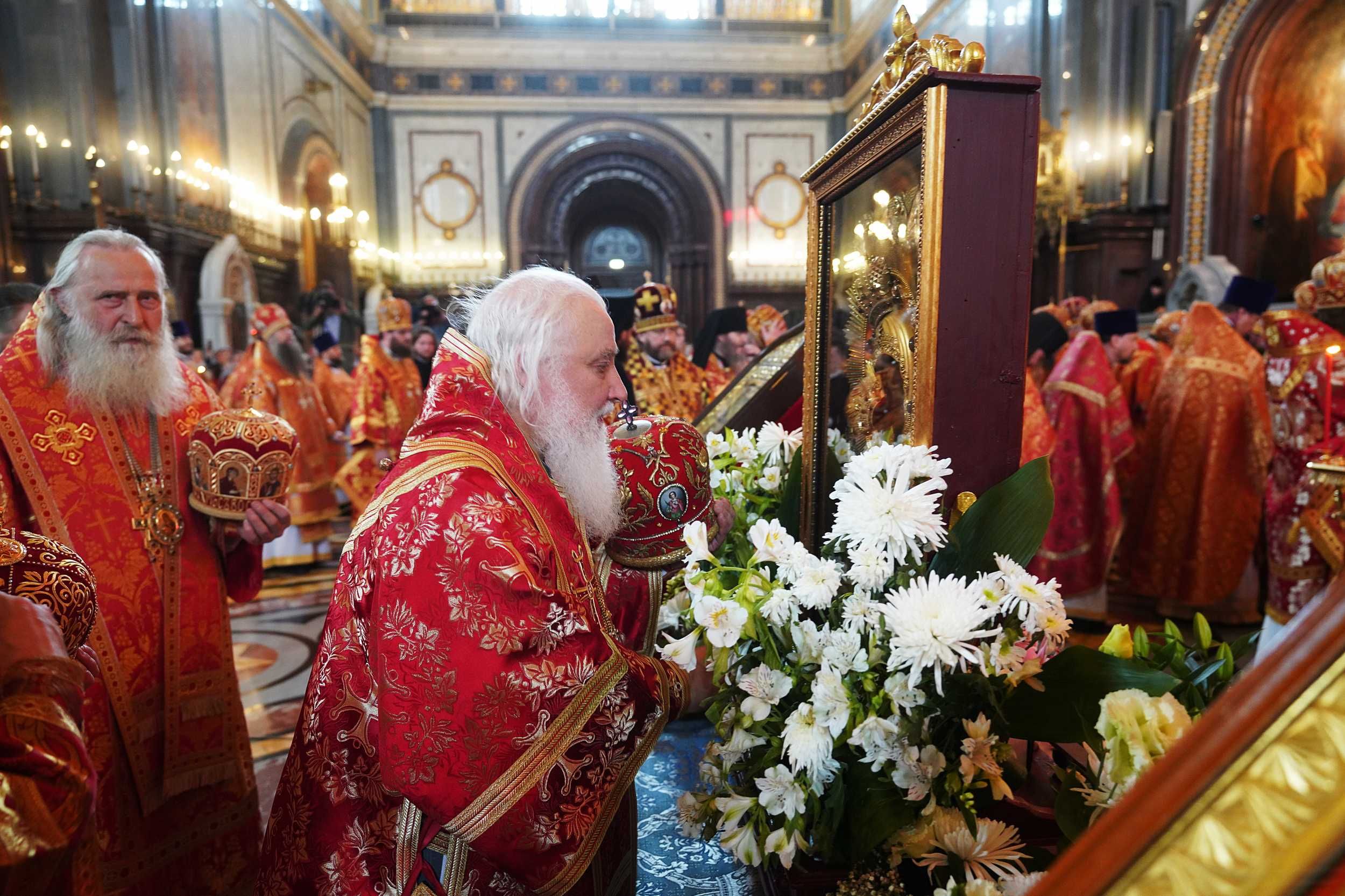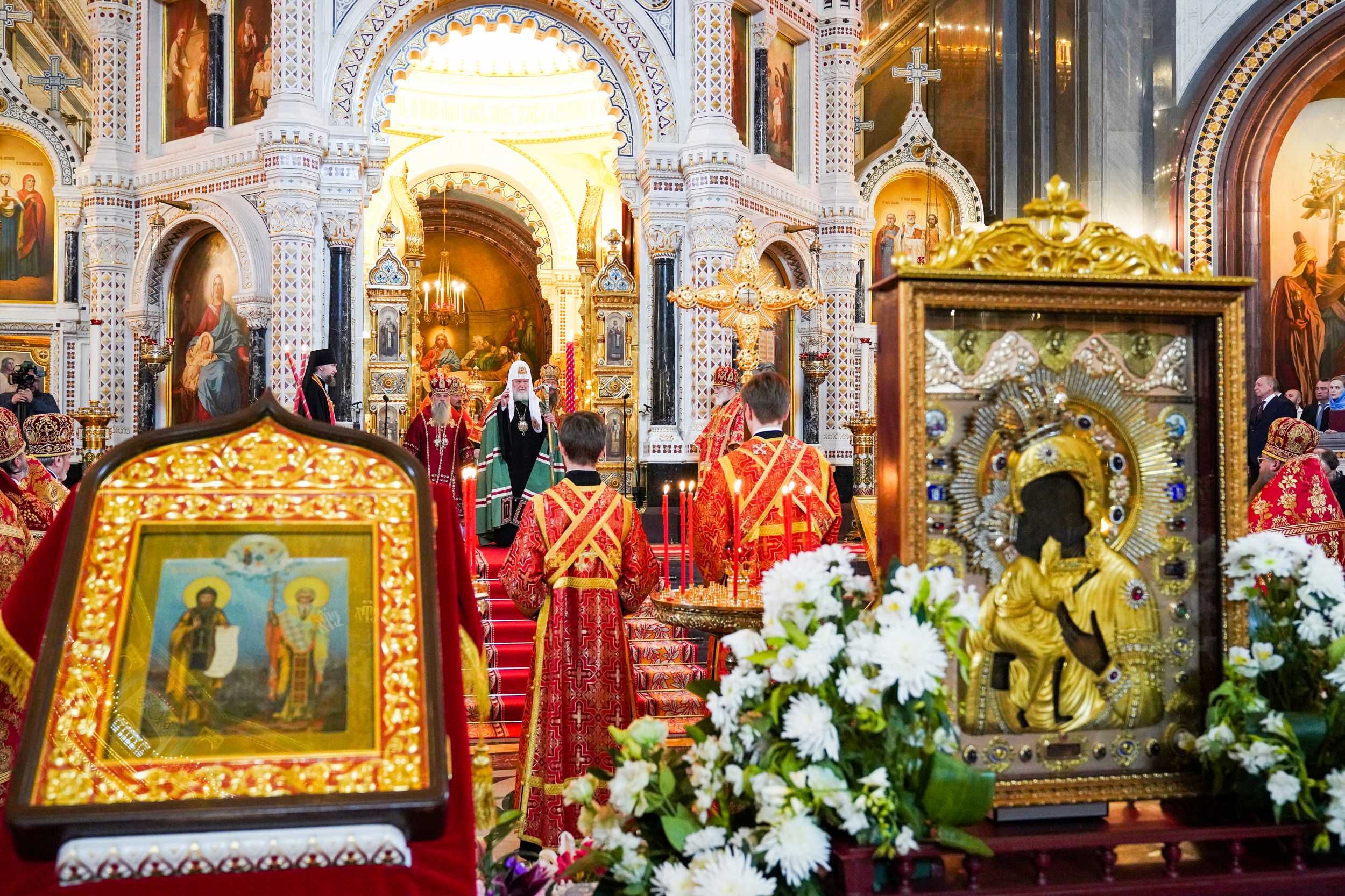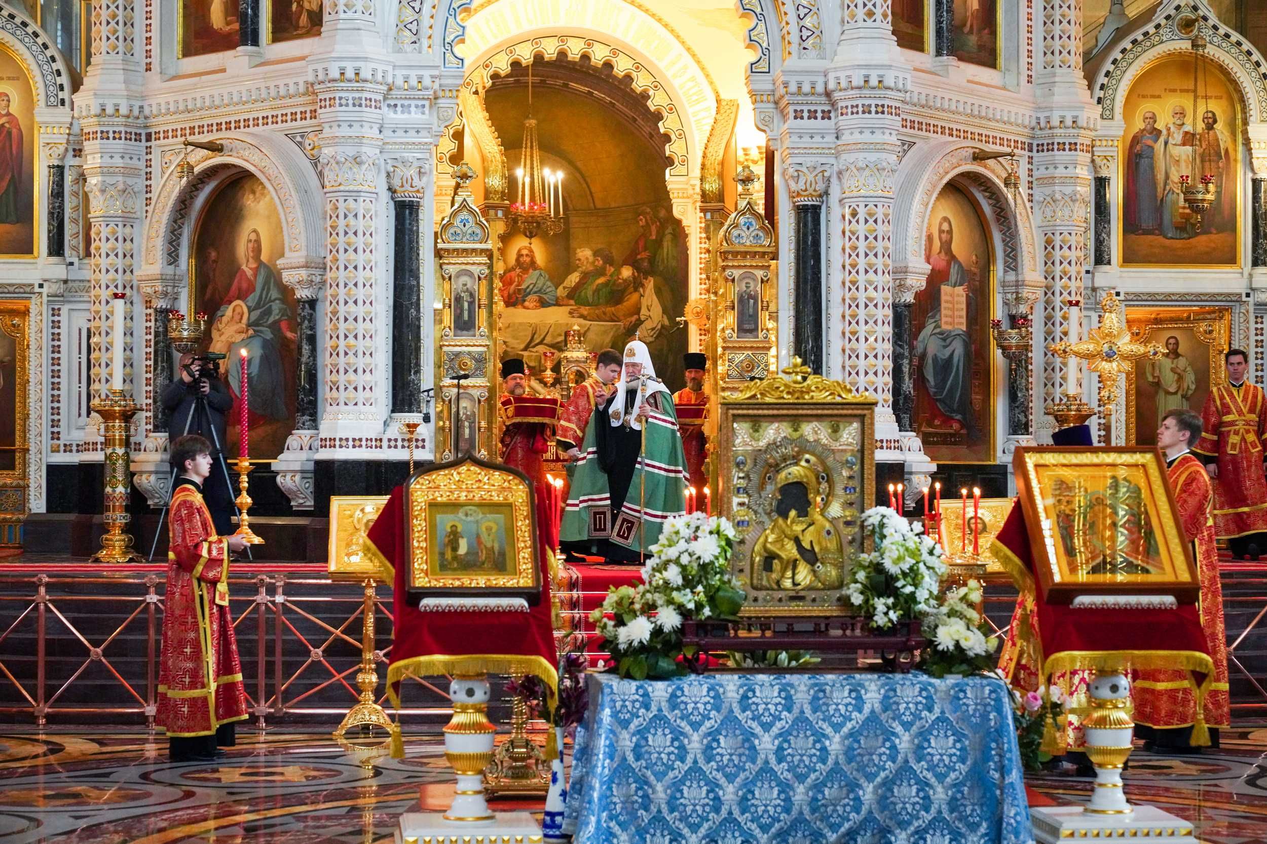 По прибытии в Храм Христа Спасителя Святейший Патриарх Кирилл поклонился чудотворной Феодоровской иконе Божией Матери, установленной в центре храма, и честным мощам святителя Филарета, митрополита Московского. Чудотворный Феодоровский образ 14 мая по благословению Его Святейшества был принесен в Москву из Богоявленско-Анастасииного монастыря г. Костромы.