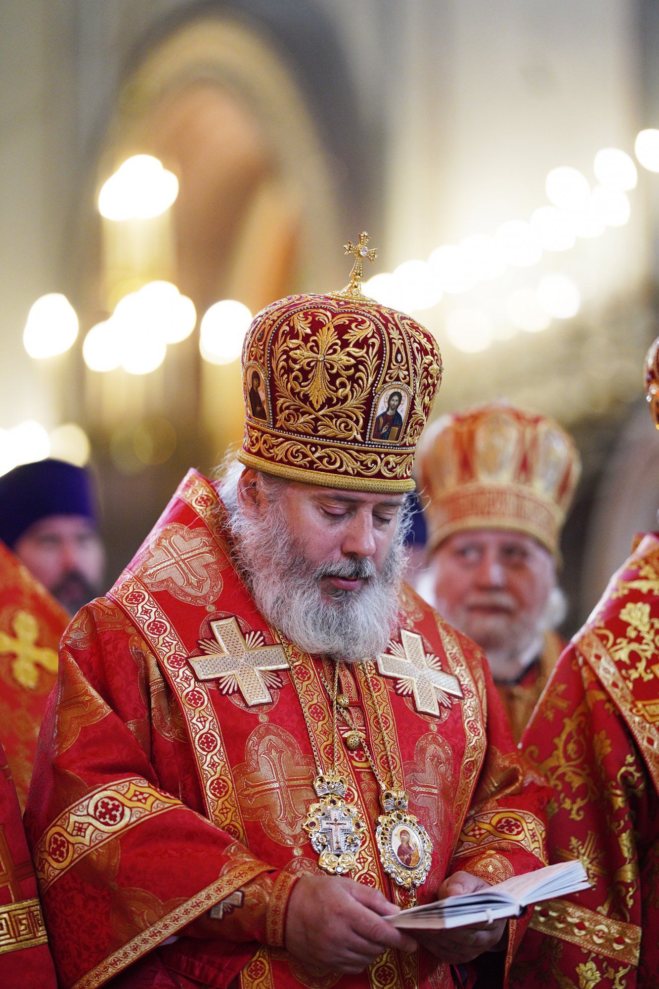 Его Святейшеству сослужили: митрополит Ювеналий (Поярков); митрополит Санкт-Петербургский и Ладожский Варсонофий; митрополит Крутицкий и Коломенский Павел, Патриарший наместник Московской митрополии; митрополит Минский и Заславский Вениамин, Патриарший экзарх всея Беларуси; митрополит Воскресенский Дионисий, первый викарий Патриарха Московского и всея Руси по г. Москве, управляющий делами Московской Патриархии; митрополит Волоколамский Антоний, председатель Отдела внешних церковных связей Московского Патриархата; митрополит Пермский и Кунгурский Мефодий; митрополит Калужский и Боровский Климент, председатель Издательского Совета Русской Православной Церкви; митрополит Воронежский и Лискинский Сергий; митрополит Самарский и Новокуйбышевский Сергий; митрополит Липецкий и Задонский Арсений; митрополит Курский и Рыльский Герман; митрополит Йошкар-Олинский и Марийский Иоанн; митрополит Казанский и Татарстанский Кирилл; митрополит Иваново-Вознесенский и Вичугский Иосиф; митрополит Ростовский и Новочеркасский Меркурий; митрополит Брянский и Севский Александр; митрополит Курганский и Белозерский Даниил; митрополит Каширский Феогност, председатель Синодального отдела по монастырям и монашеству; митрополит Тамбовский и Рассказовский Феодосий; митрополит Нижегородский и Арзамасский Георгий; митрополит Симбирский и Новоспасский Лонгин; митрополит Тверской и Кашинский Амвросий, председатель Синодальной богослужебной комиссии; митрополит Сингапурский и Юго-Восточно-Азиатский Сергий, Патриарший экзарх Юго-Восточной Азии; митрополит Ставропольский и Невинномысский Кирилл, председатель Синодального комитета по взаимодействию с казачеством, председатель Синодального отдела по взаимодействию с Вооруженными Силами и правоохранительными органами; митрополит Орловский и Болховский Тихон; митрополит Саранский и Мордовский Зиновий; митрополит Вологодский и Кирилловский Савва; митрополит Саратовский и Вольский Игнатий; митрополит Архангельский и Холмогорский Корнилий; митрополит Владивостокский и Приморский Владимир; митрополит Клинский Леонид, Патриарший экзарх Африки; митрополит Ижевский и Удмуртский Викторин; митрополит Псковский и Порховский Тихон, председатель Патриаршего совета по культуре; митрополит Волгоградский и Камышинский Феодор; митрополит Челябинский и Миасский Алексий; собор иерархов Русской Православной Церкви.