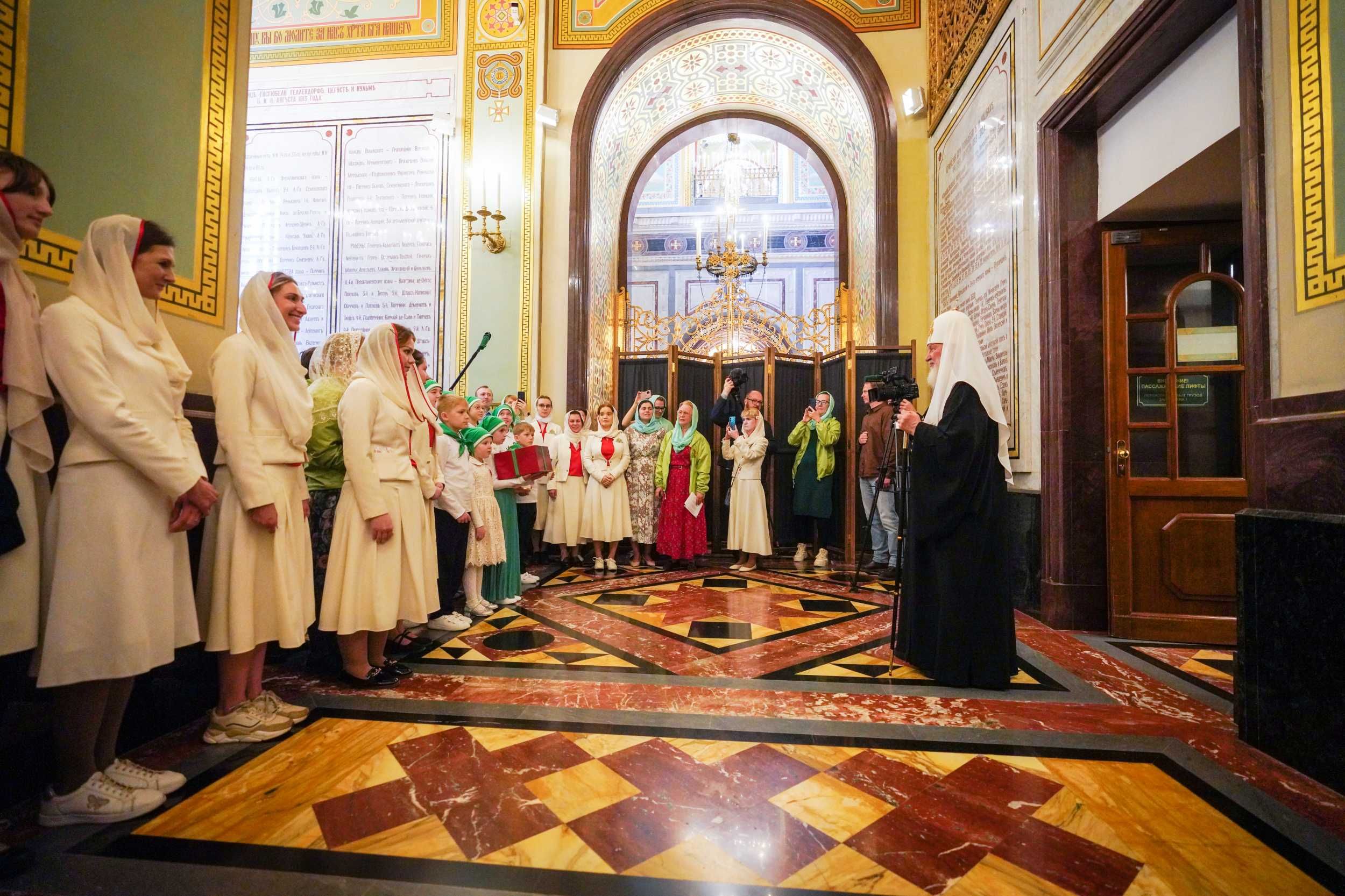 По завершении богослужения в галерее за алтарем Храма Христа Спасителя Святейшего Патриарха Кирилла с днем тезоименитства поздравили участники движения «Патриаршие добровольцы», а также учащиеся воскресной школы «Сретение» при храме праведного Иоанна Кронштадтского в Жулебине г. Москвы.