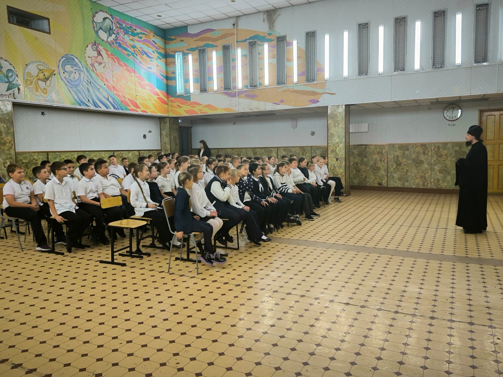 Такая обширная тема была выбрана для разговора священнослужителя с учениками 4-ых классов в СОШ №20 п. Врангель. Беседу, по благословению епископа Николая, провел иеродиакон Филарет (Каширский).