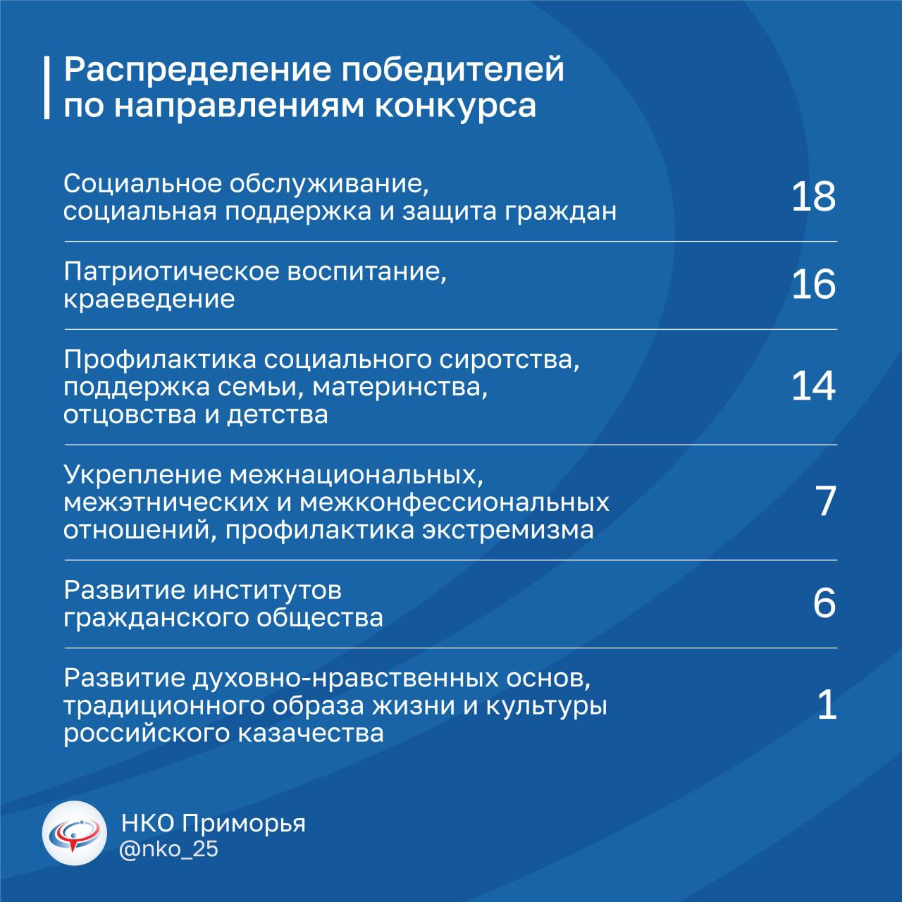 В этом году победителями стали 6️⃣2️⃣ некоммерческие организации Приморского края. Всего на конкурс поступило 109 заявок.