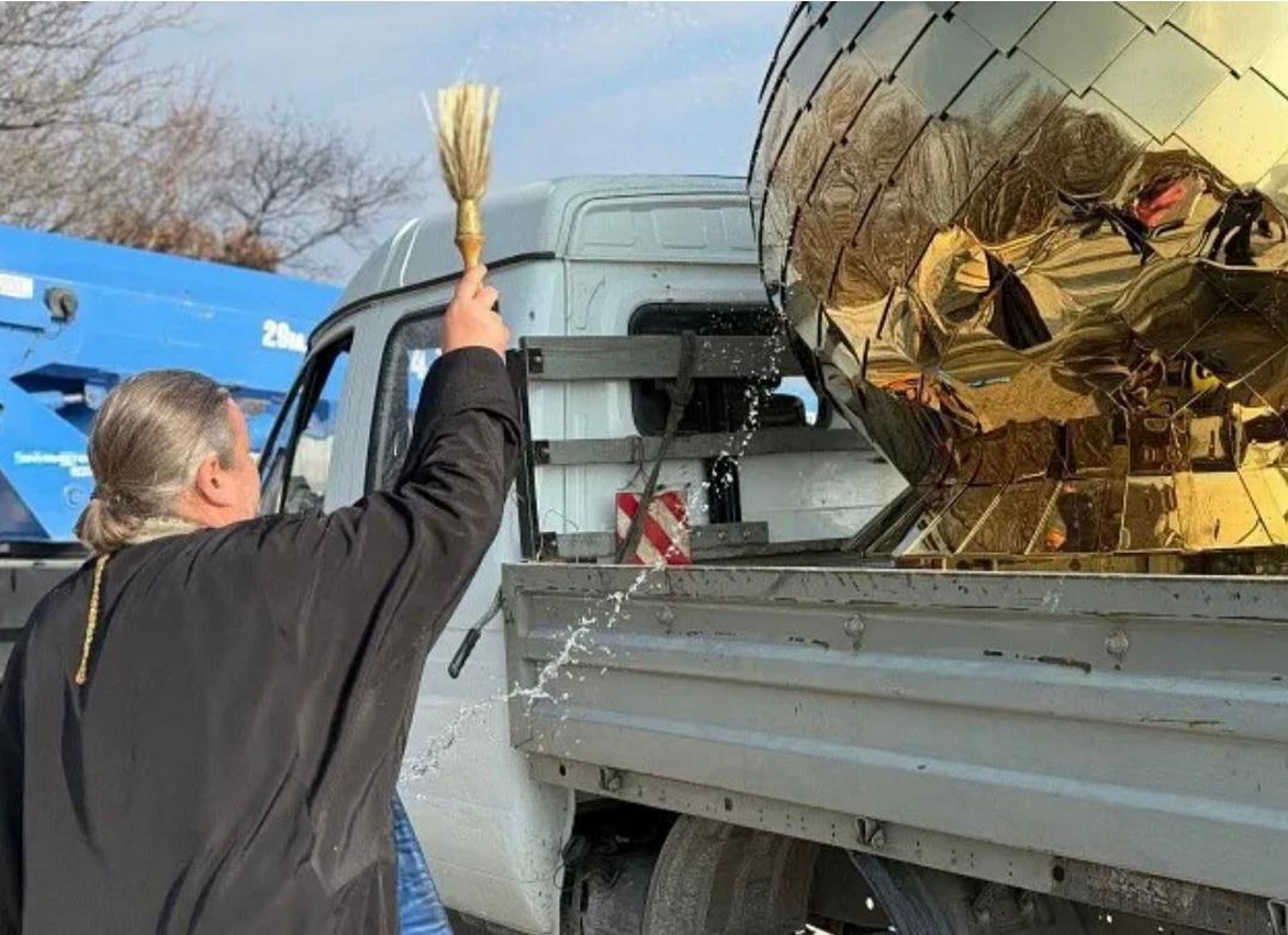 Торжественное освящение провел иерей Виталий Шаркеев. После молитвы купол подняли и установили на звонницу. Общий вес конструкции — около 300 килограммов. Венчает его крест высотой 1,7 метра. Обновлена также сама форма купола – теперь он выполнен в традиционном православном стиле в виде пламени свечи
