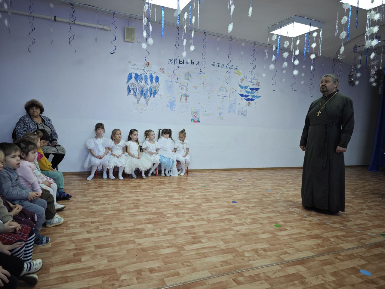 Отец Виталий поздравил дошколят и провел беседу с детьми о смысле названия праздника, о важности сохранения связи поколений, передал юным слушателям теплые пожелания здоровья и счастья.