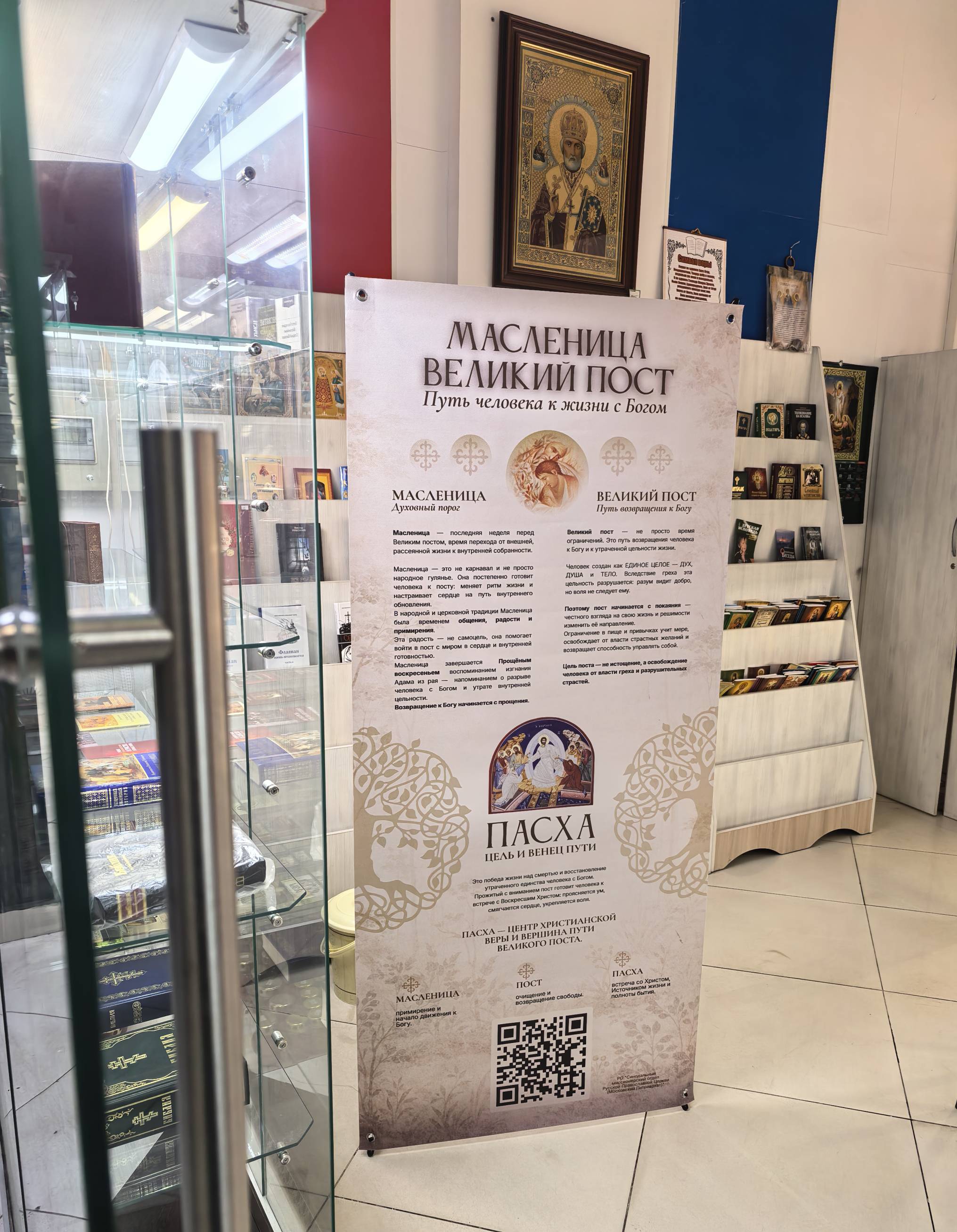На стенде представлена информация, помогающая понять смысл событий Масленицы и Великого поста, венцом которого является Пасха. Стенд акцентирует внимание на покаянии, самоотверженности и молитве, которые предлагает Великий пост как путь, ведущий к Богу.