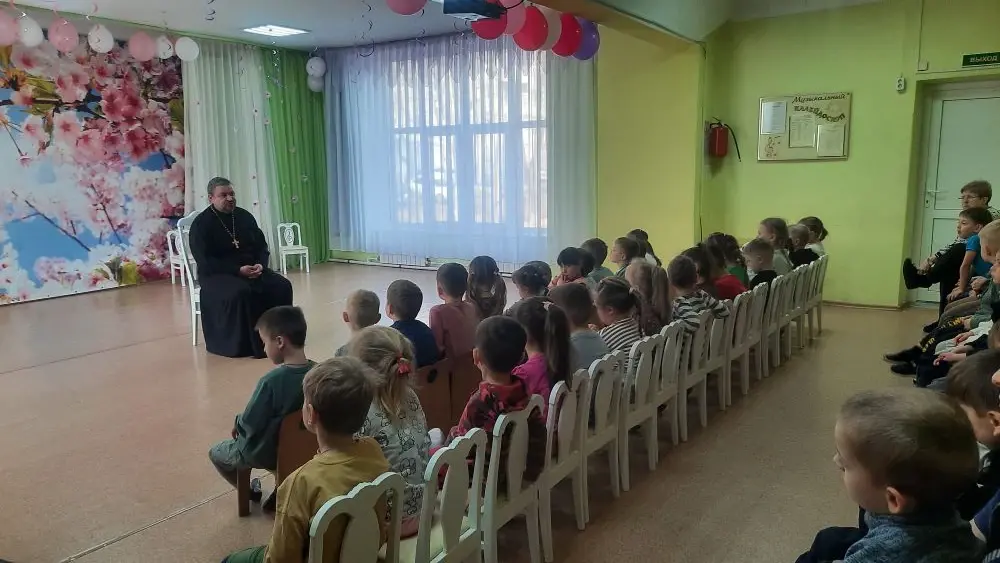 Руководитель миссионерского отдела Находкинской епархии иерей Виталий Шаркеев посетил детский сад № 39 г. Находки и побеседовал с дошкольниками о предстоящей Пасхе — Светлом Христовом Воскресении.