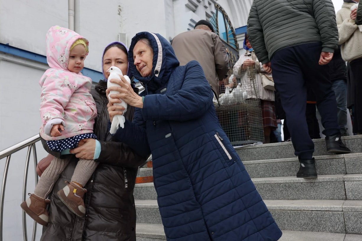 По окончании богослужения Преосвященный Николай, с паперти верхнего храма, выпустил в небо над Кафедральным собором белых голубей.