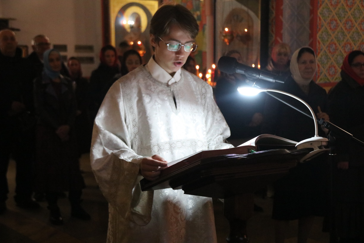 По традиции, за Пасхальной заутреней, Преосвященный Владыка прочитал Слово огласительное святителя Иоанна Златоуста на Святую Пасху.