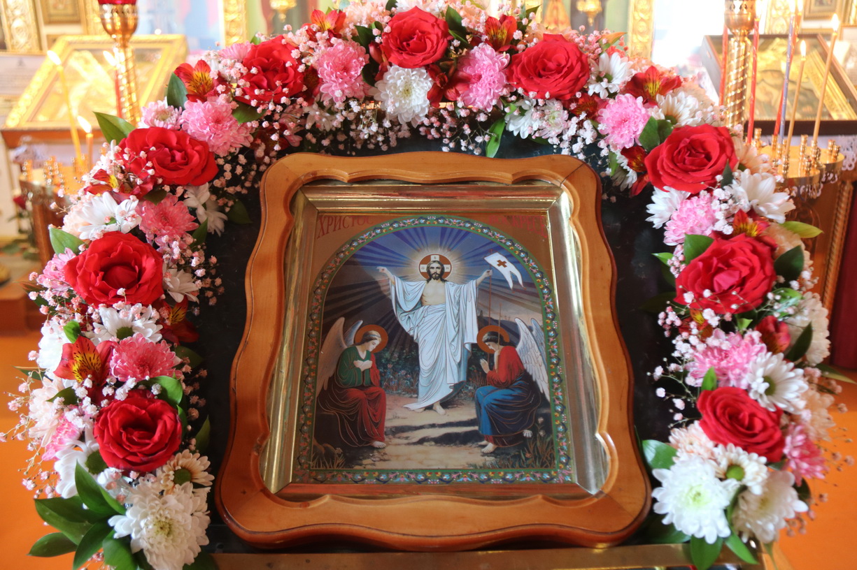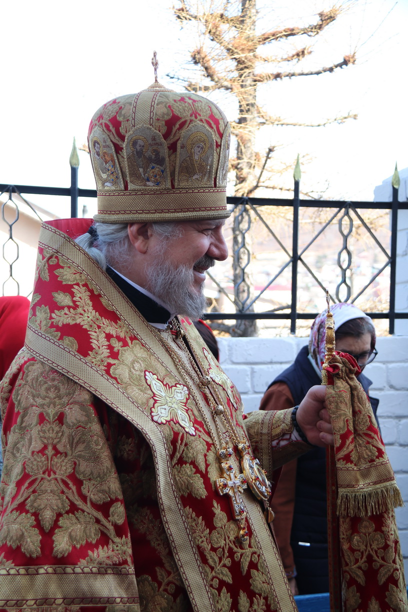 По замвонной молитве, епископ Николай возглавил праздничный пасхальный крестный ход и обратился к прихожанам храма с архиерейским словом, в котором поздравил всех с Пасхой Христовой.