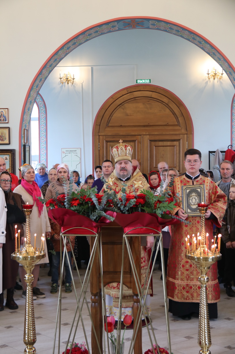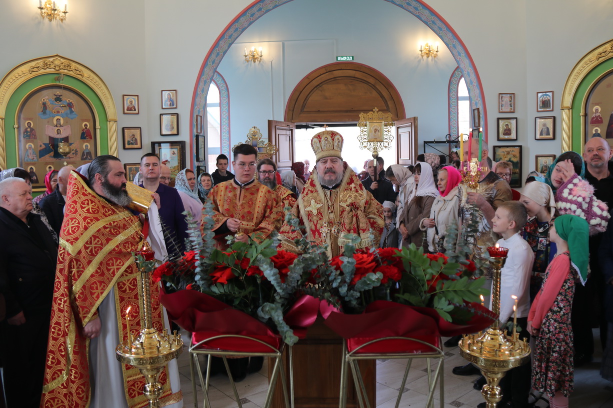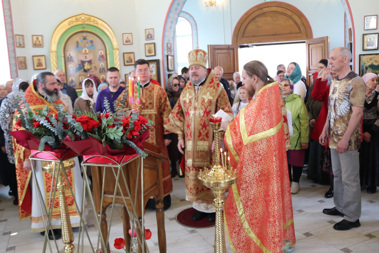 По заамвонной молитве епископ Николай, в сослужении духовенства, совершил праздничное славление, крестный ход и обратился к прихожанам храма с воскресной проповедью, в которой поздравил всех с праздником Христова Восресения.